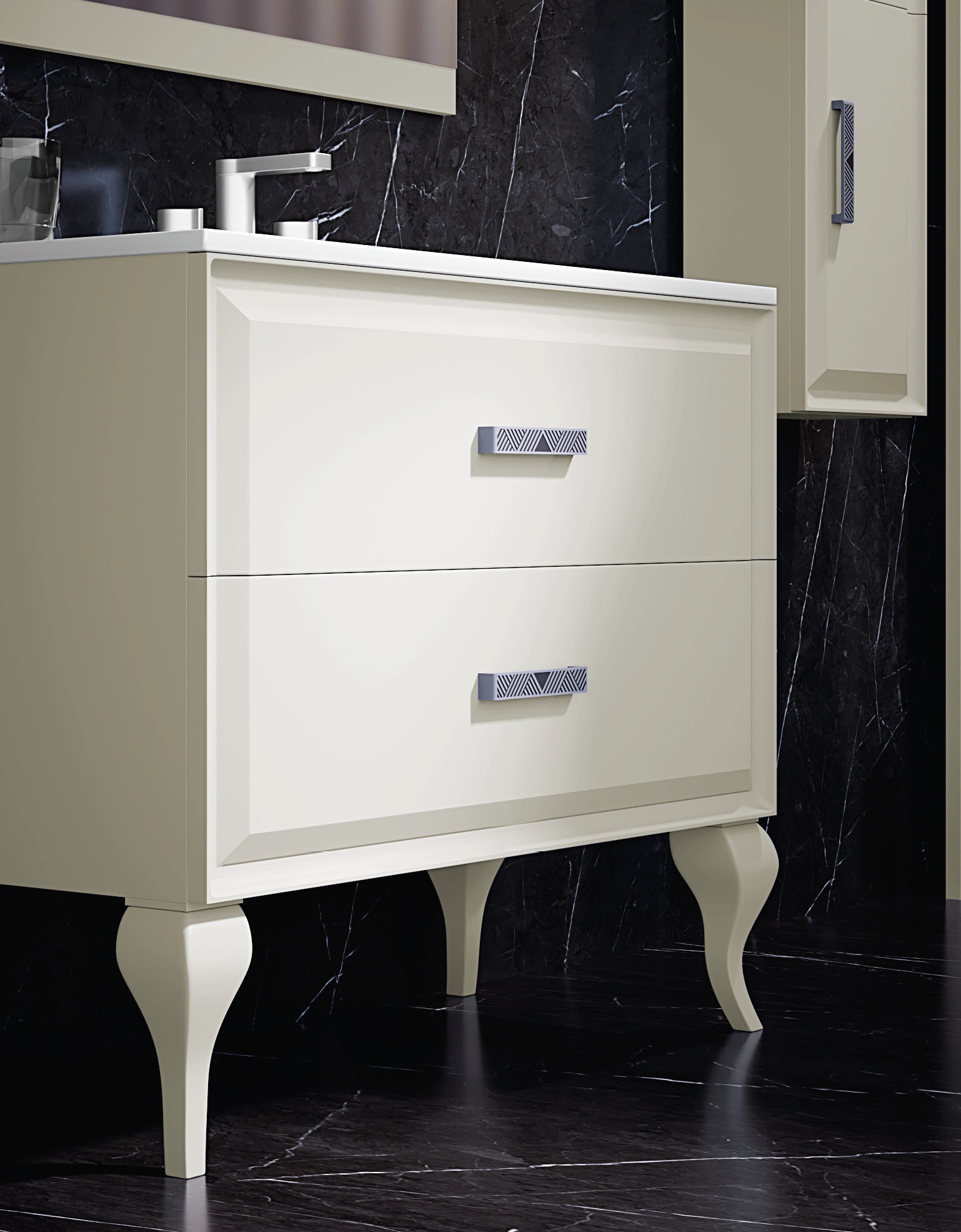 Conjunto mueble de baño, modelo Alda con 2 cajones y 4 patas Isabelinas.
